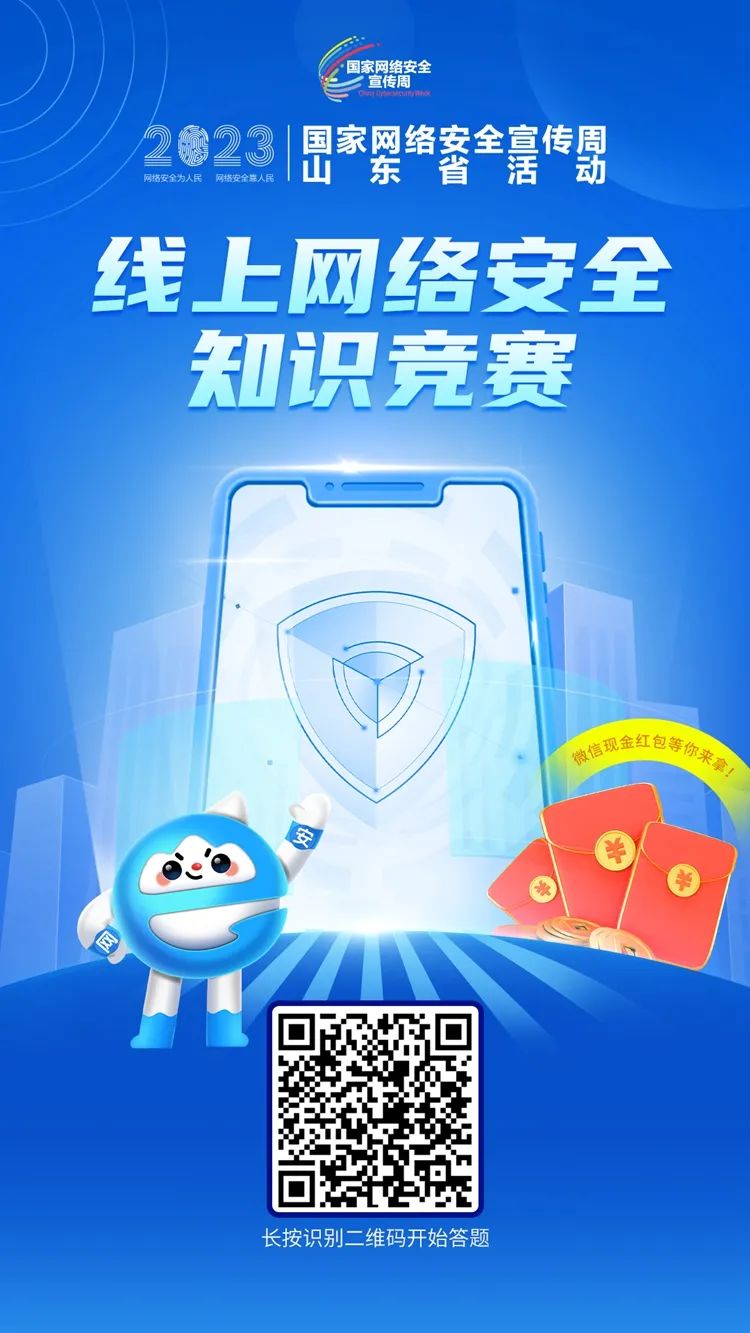 為面向廣大網(wǎng)民普及網(wǎng)絡(luò)安全知識(shí),引導(dǎo)網(wǎng)民樹立正確網(wǎng)絡(luò)安全觀念,提升網(wǎng)民防護(hù)意識(shí),2023國家網(wǎng)絡(luò)安全宣傳周山東省活動(dòng),線上網(wǎng)絡(luò)安全知識(shí)競賽即將上線,輕松答題贏紅包,答題活動(dòng)時(shí)間為9月10日—17日,微信掃描下方二維碼即可進(jìn)入?yún)⑴c。